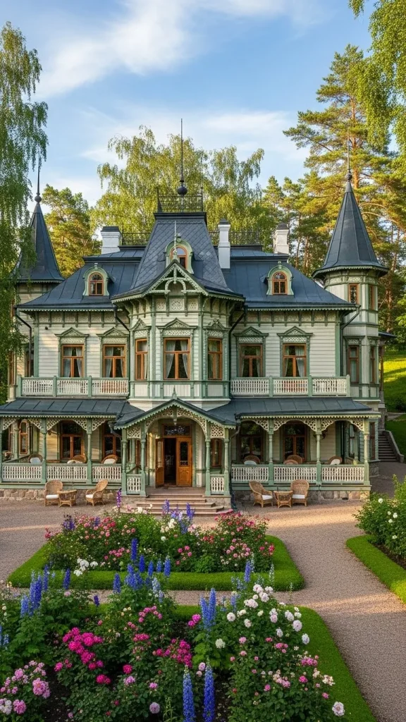 This mansion draws inspiration from Neuschwanstein. It has tall white towers and blue roofs.