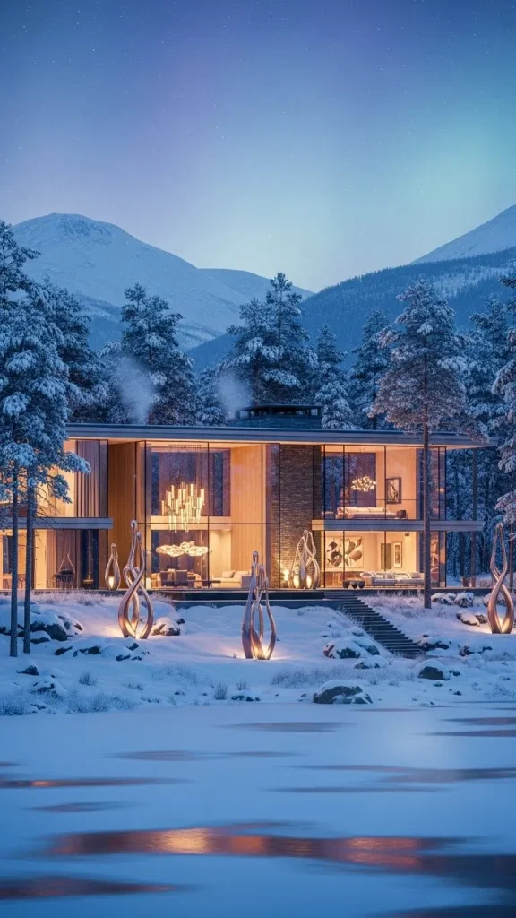 This mansion embraces the winter landscape fully. It is constructed largely of glass and steel.
