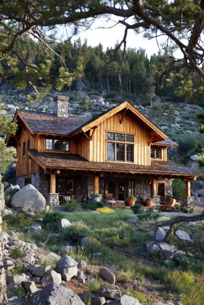 This ranch house is built directly into a rocky hillside, utilizing a massive stone foundation. The stone is harvested from the property itself, ensuring a perfect color match with the environment. This makes the house look like it is emerging from the mountain.