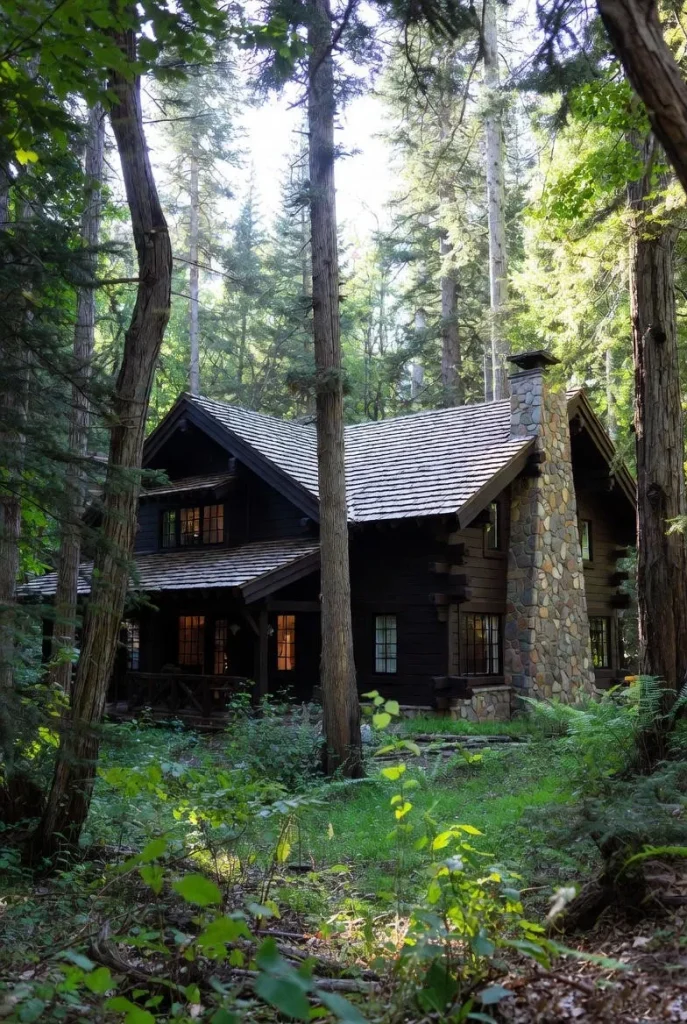 The exterior is painted a deep forest green with white accents on the porch railings. This color scheme allows the house to blend into the surrounding pine and fir trees. A large stone chimney adds a sense of verticality to the horizontal design.
