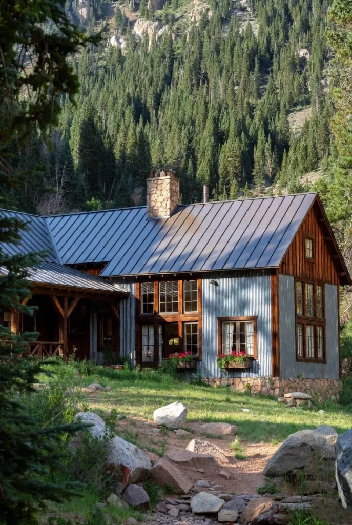 This modern ranch house uses industrial materials like corrugated metal and steel. These materials are chosen for their durability and low maintenance in a harsh mountain climate. The result is a home that feels strong, modern, and slightly edgy.