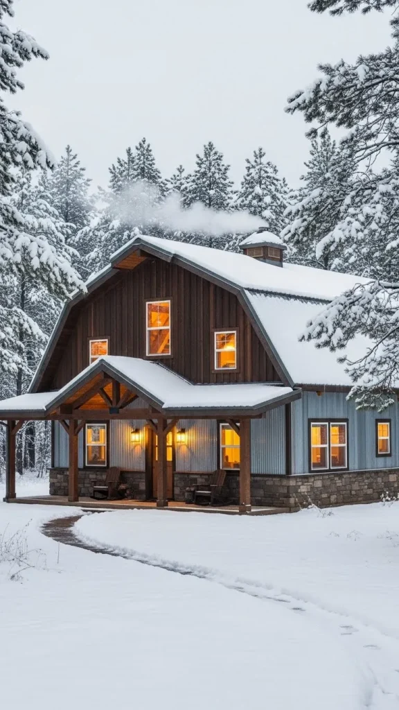 Large sliding barn doors can cover glass walls. Metal roofs are practical for shedding heavy snow. The interior mixes industrial and rustic elements.