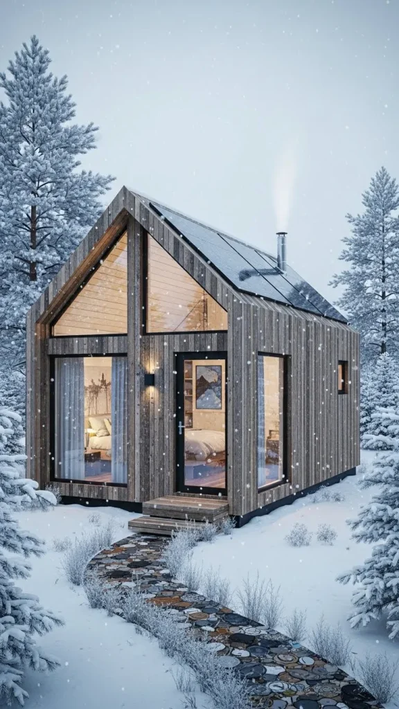 A loft bed is tucked under the roofline. The exterior often features creative siding materials. It looks like a toy house amidst the vast landscape.