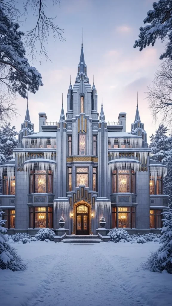This style brings the glamour of the 1920s to winter. Geometric shapes and zigzags appear in the facade. Smooth stucco or stone is used for a sleek look.