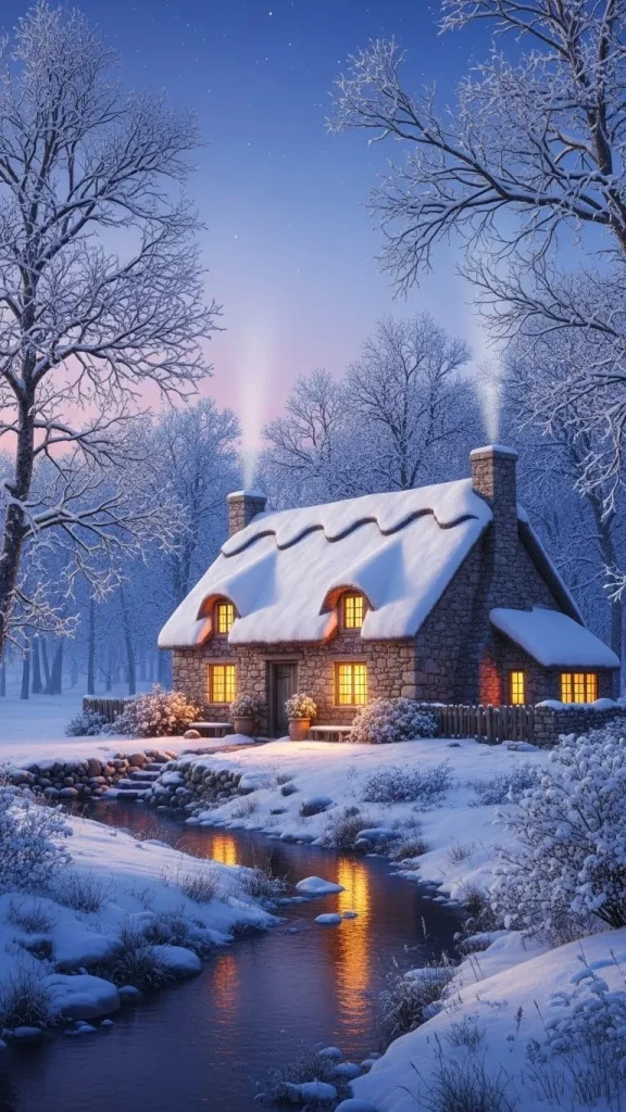 Small deep set windows create cozy pockets of light. The roof is often slate or thatch which looks timeless. Moss and ivy may still be visible under light snow.