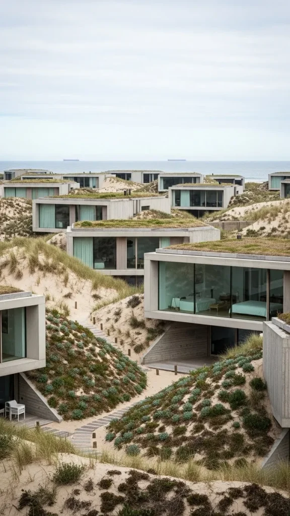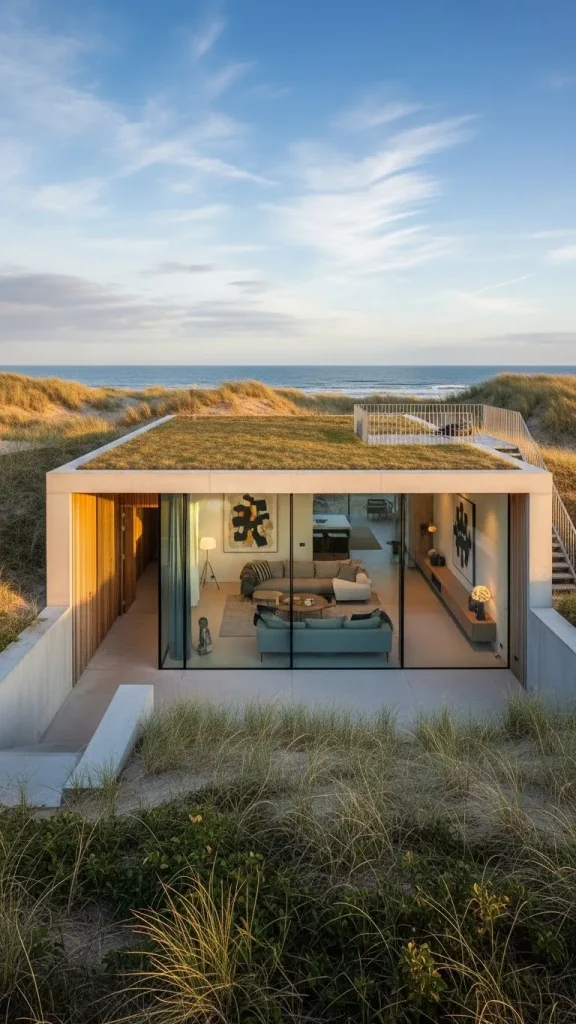 Built directly into the sand dunes this house is incredibly low profile. The roof is curved to allow wind to pass over it smoothly without resistance. From the street it looks like a simple retaining wall in the sand.