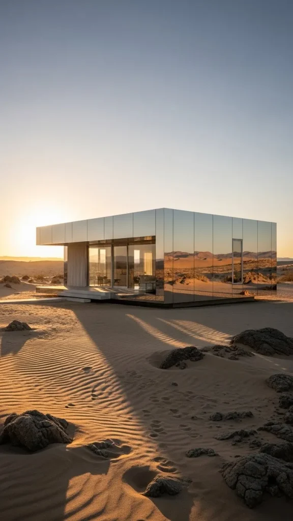 This house is clad entirely in reflective mirrored glass panels. It reflects the desert sky and cactus landscape to become invisible. From a distance it appears like a mirage or a gap in the horizon.