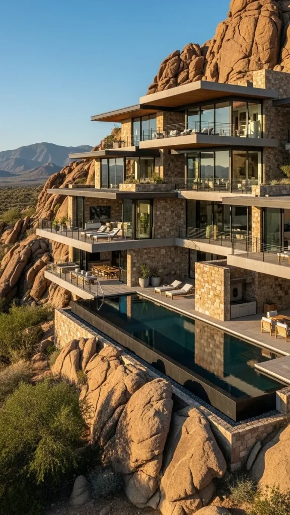 This house is built into and around massive natural boulders. The architecture accommodates the stone features rather than removing them. Some rooms have giant rocks serving as interior walls or furniture.