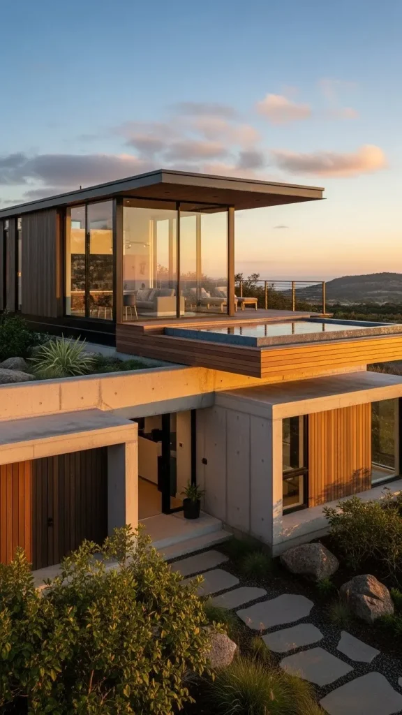 The aesthetic is industrial yet softened by the blue ocean views. Wood accents inside warm up the cold grey concrete walls. A rooftop deck offers private sunbathing behind high parapet walls.