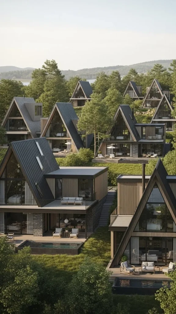 This is a modern black A frame with a steep pitch for drama. The entire front triangle is glass facing the mountains for views. The steep roof sheds snow instantly to prevent heavy buildup on top.