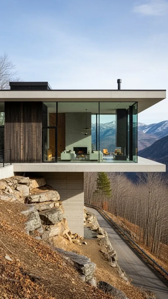 Jutting out from a snowy slope is a rectangular box home. One end is anchored to the rock the other hangs in the air. The floating end features a glass wall with valley views that are stunning.