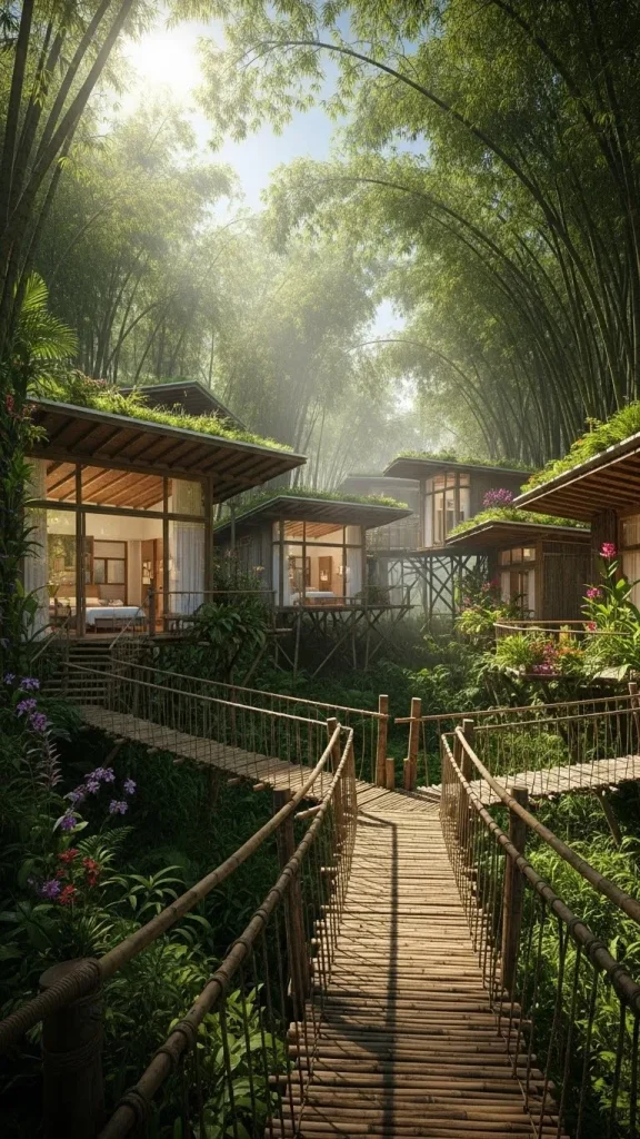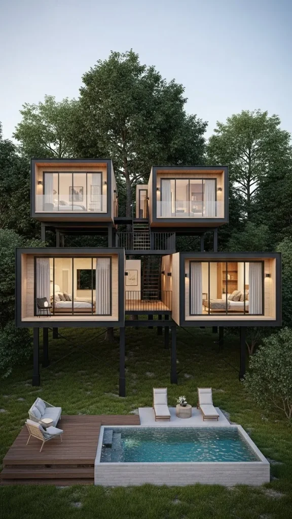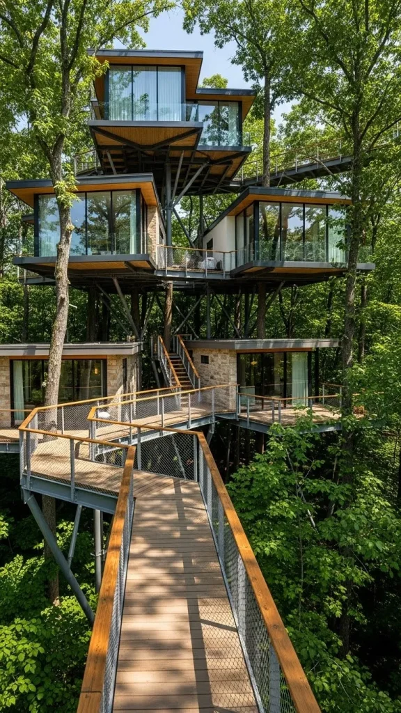 This home is a series of pods connected by suspended bridges. It creates a journey through the canopy of the trees above ground. Each pod serves a different function like sleeping or eating or bathing.