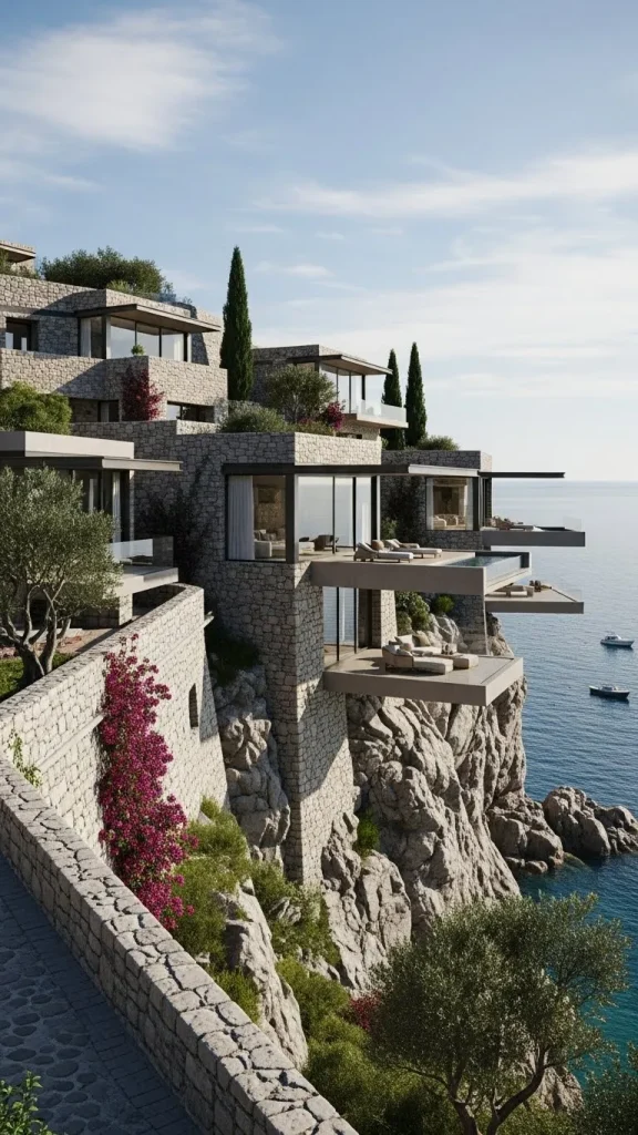 An infinity pool blends the terrace water with the sea below visually. The interior uses stone and grey tones for a cohesive and calming look. Automated blinds provide privacy from passing boats or helicopters.