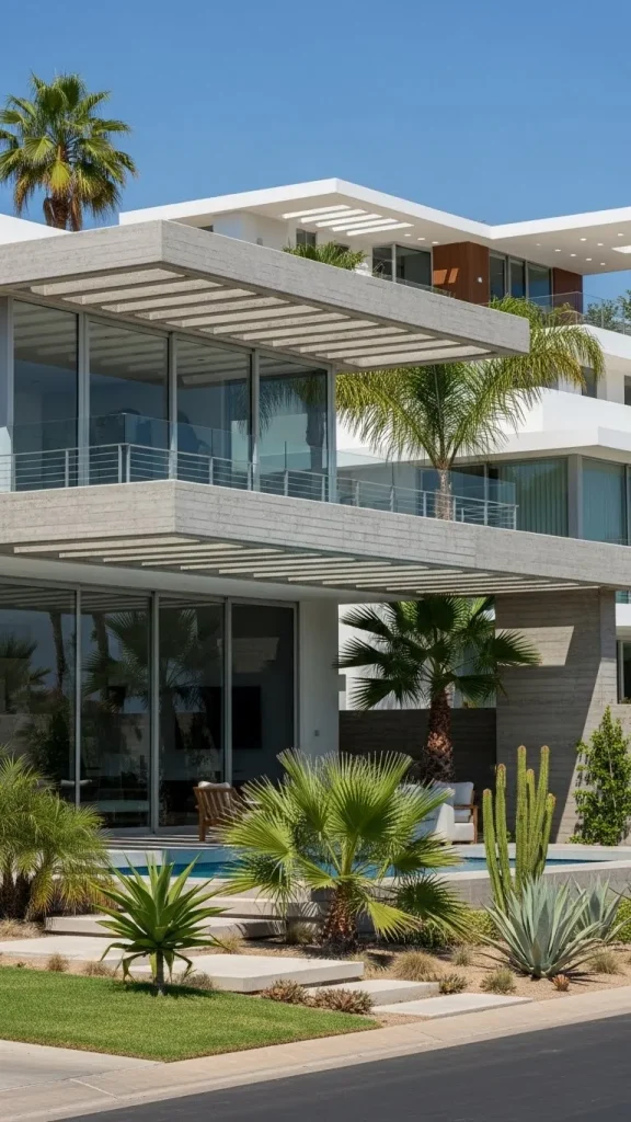 This home features sharp angles and geometric concrete shapes that command attention. It turns a blank wall to the neighbors for maximum seclusion and privacy. Strategic slots in the walls allow light but block direct views in.