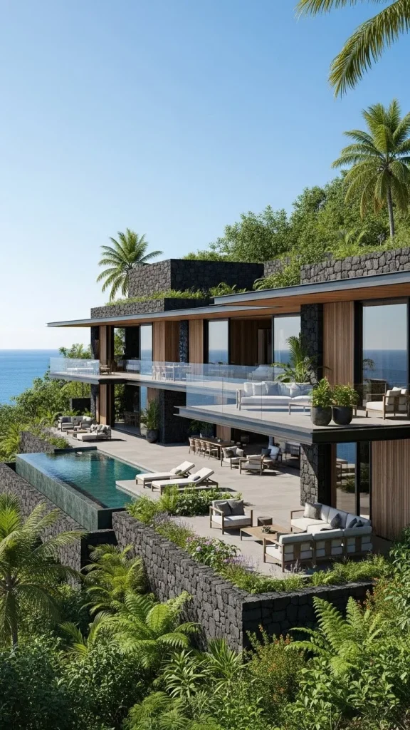 Black volcanic stone forms the walls of this retreat for texture. It contrasts beautifully with the bright green plants of the garden. The stone stays cool even in the tropical heat of the day.