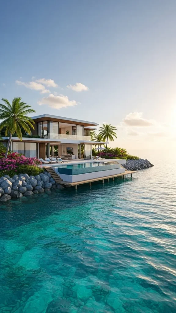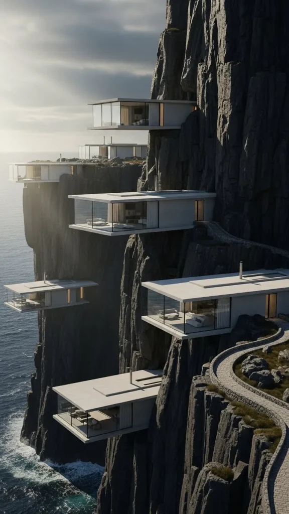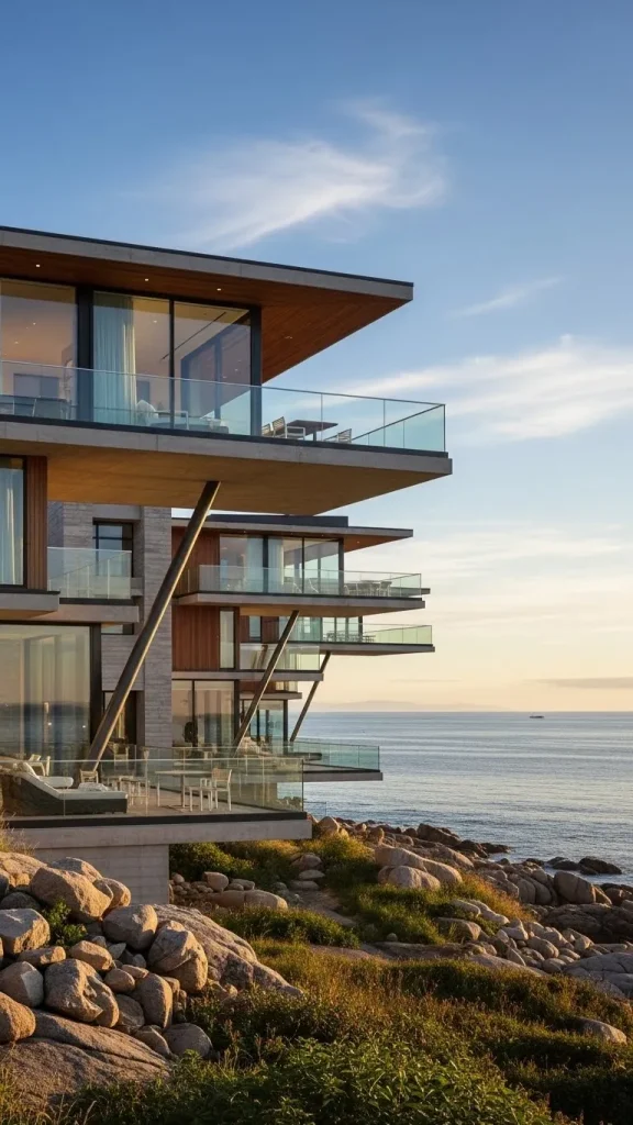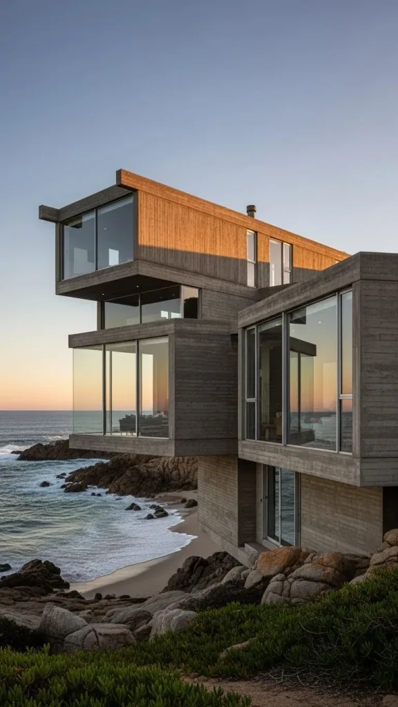 A massive concrete beam extends this house over the water dramatically. It feels daring and isolates the residents from the land behind them. Glass floor panels in the living room show the crashing waves below.