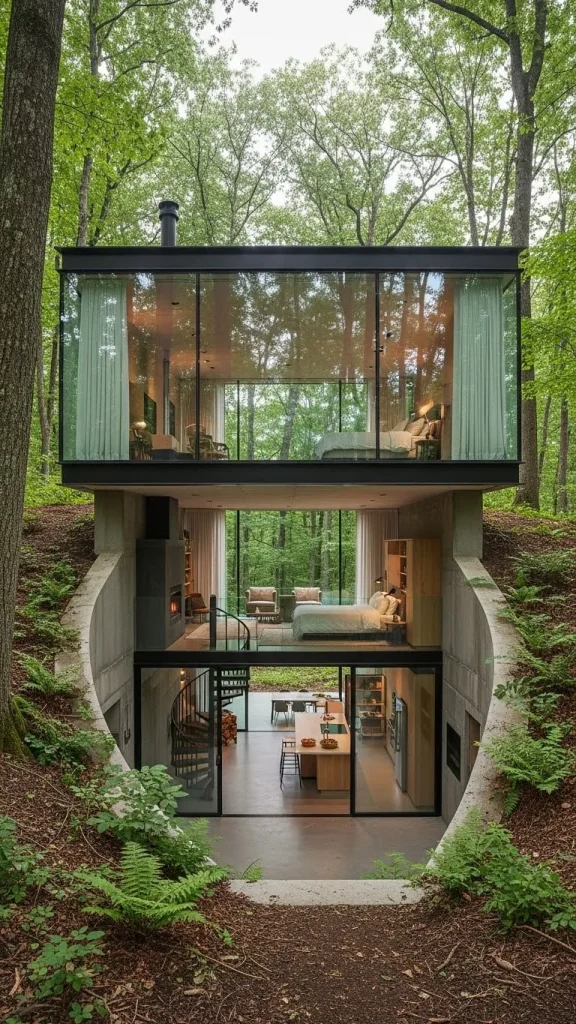 Half of this house is buried beneath the forest floor to minimize its visual footprint. A green roof covered in ferns masks the structure from above completely. The front facade is the only visible part comprising a wall of glass.