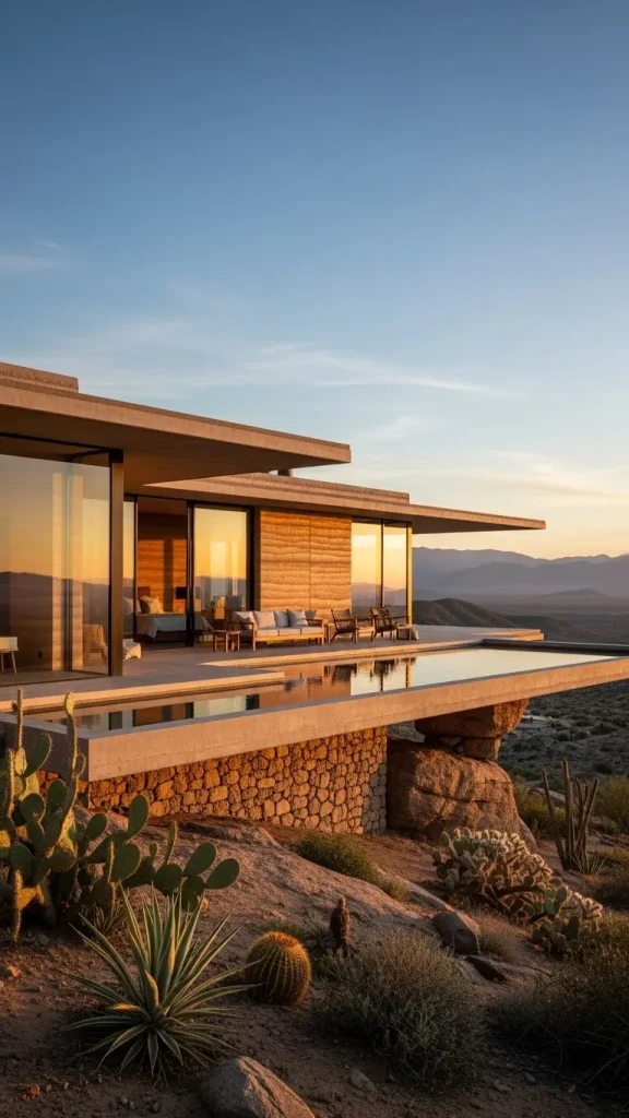 Wide sliding doors open the corners of the house completely to the desert. This blurs the line between the indoor lounge and the vast outdoors. A fire pit on the patio is the focal point for cold desert nights.