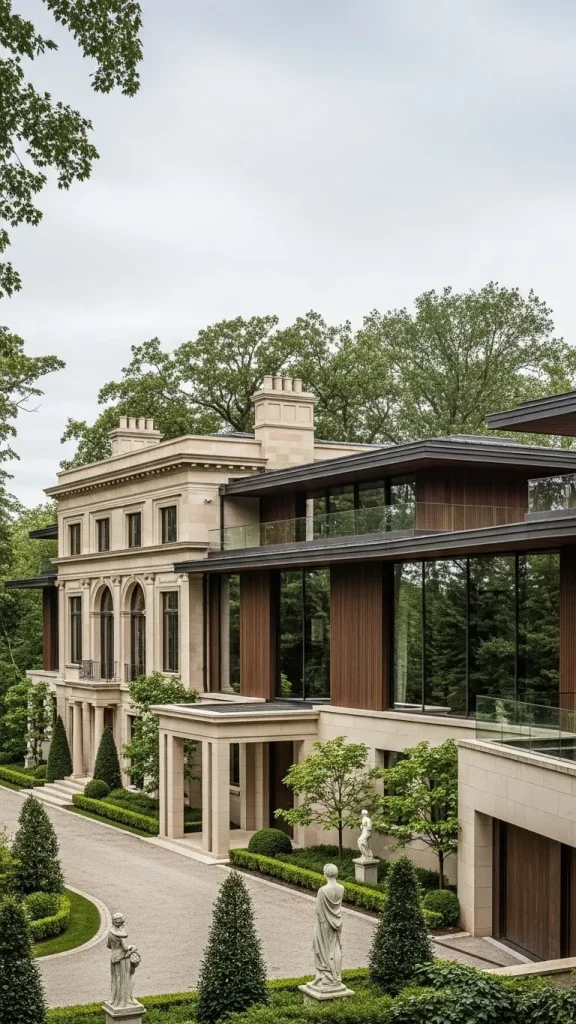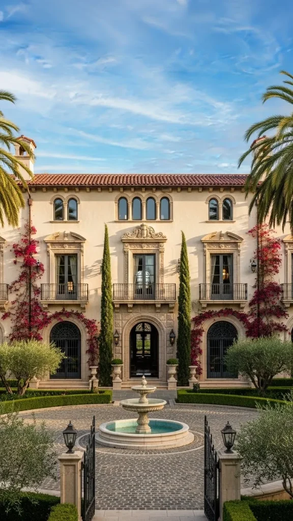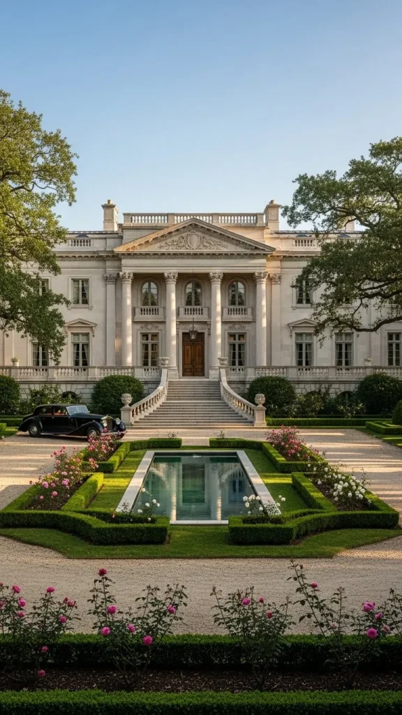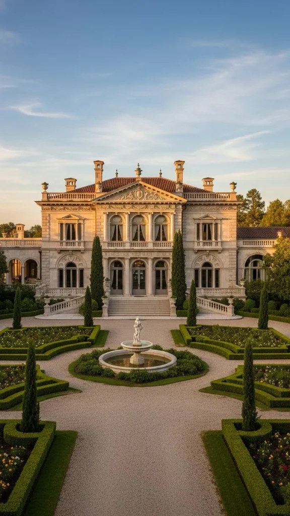 The use of limestone is common in these designs, providing a soft and glowing exterior that changes with the light. It is a style that celebrates grand entrances and sweeping staircases.
