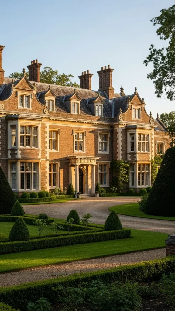 These homes often feature a great hall with a high ceiling and a massive staircase. The brickwork is often very detailed, using different colors of brick to create patterns.