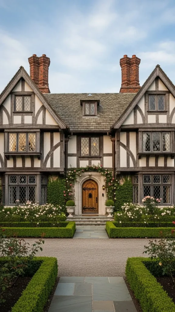 The English Tudor style is easily recognized by its decorative half timbering and steep gables. It evokes the feeling of a historic village and a connection to the forested lands of Britain.