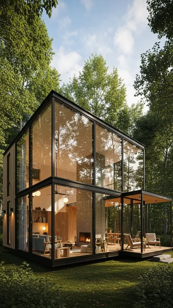 These cabins feature floor-to-ceiling glass walls to blur the line between inside and outside. The structure is often steel or engineered wood to support the glazing. Privacy comes from the seclusion of the location rather than curtains.
