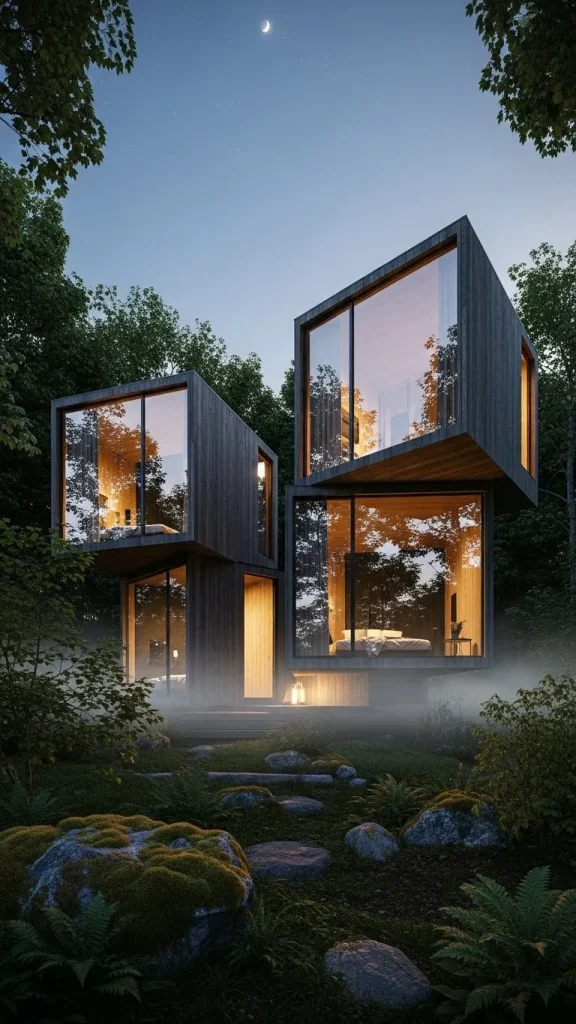 Built partially into the earth or from cast concrete, these cabins are virtually indestructible. They offer excellent sound insulation and thermal mass. The aesthetic is industrial yet oddly soothing in its simplicity.