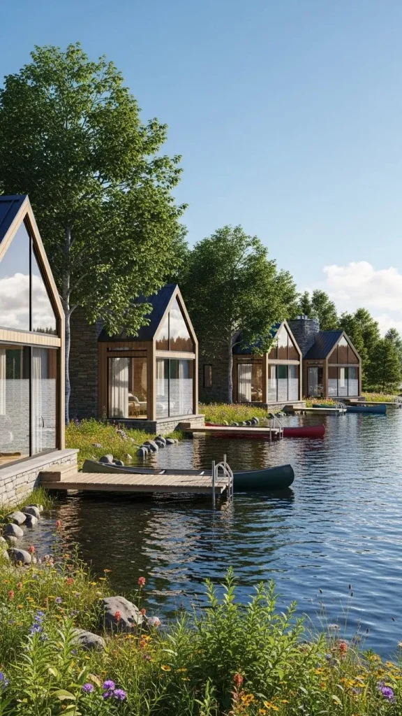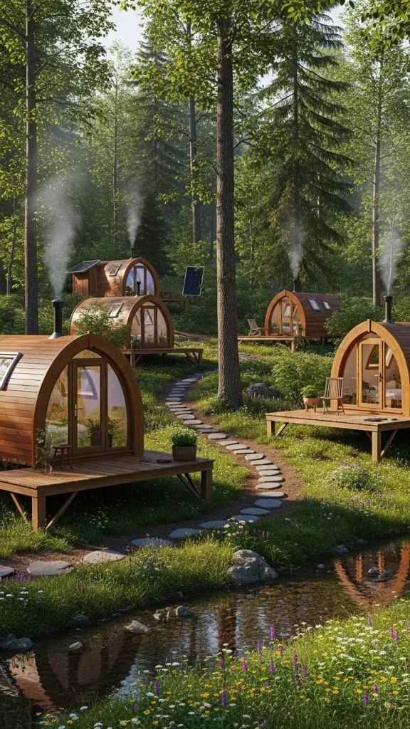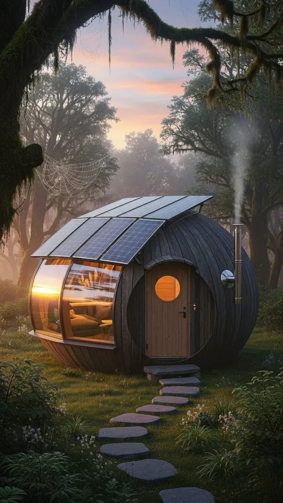 Designed for sustainability, these small cabins generate their own power. The roof is angled specifically to maximize solar panel efficiency. They often utilize composting toilets and rainwater collection systems.