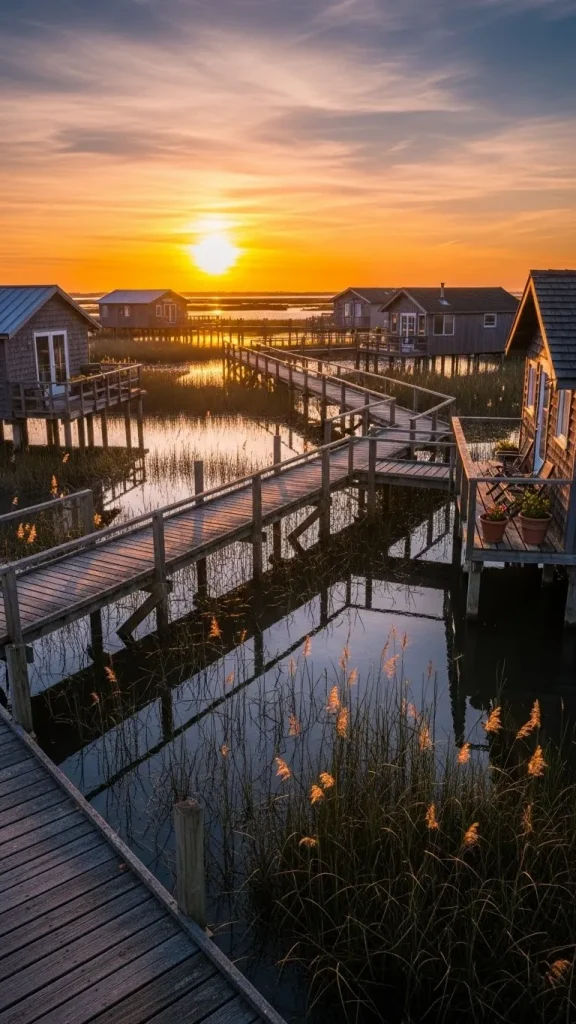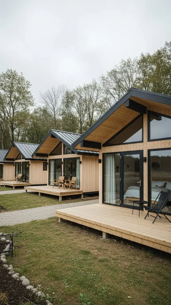 Inspired by Swiss architecture, these cabins feature wide eaves and decorative carved balconies. They are designed to handle heavy snowfall while offering cozy interiors. The extensive use of wood paneling creates a warm “glow” inside.