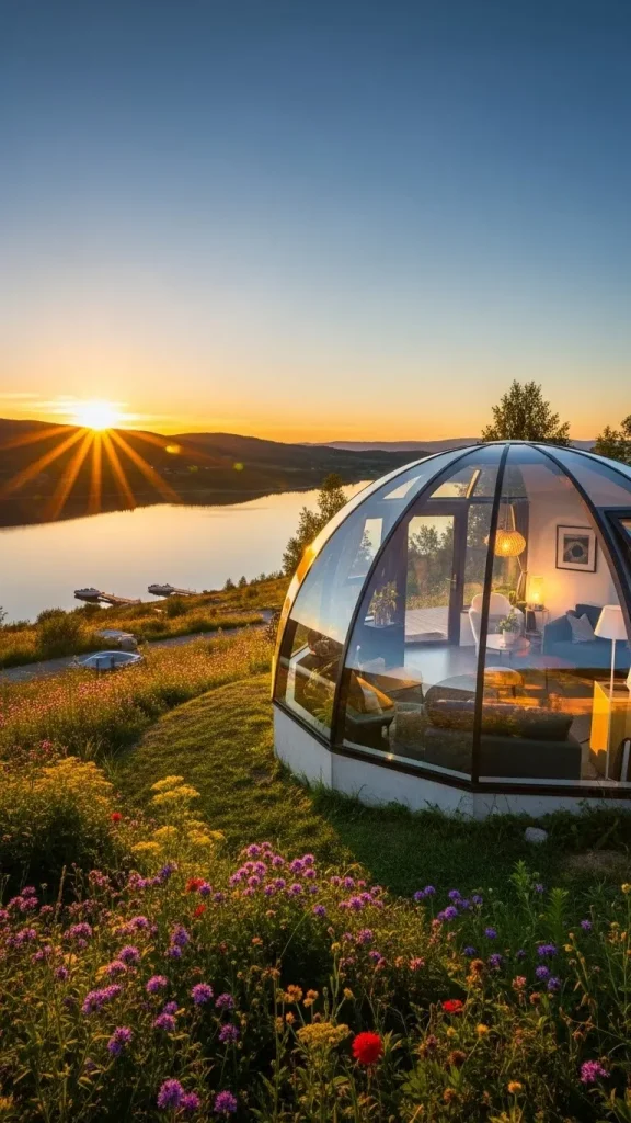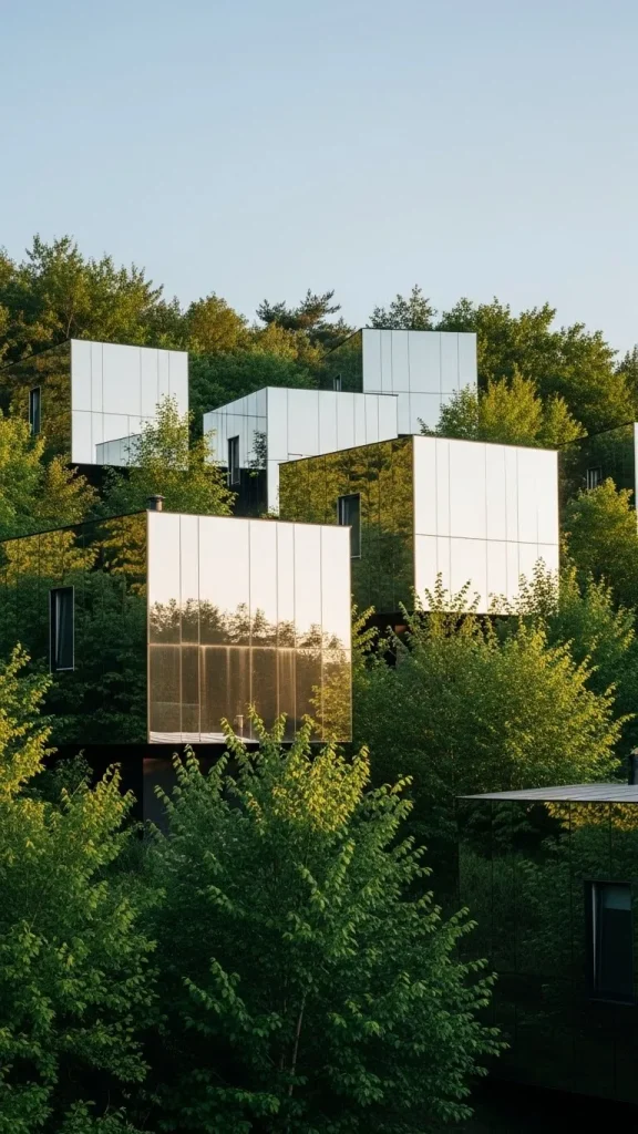 Clad in reflective aluminum or mirrored glass, this cabin disappears into its surroundings. It reflects the forest, sky, and ground, becoming a chameleon. It creates a surreal visual experience for anyone approaching it.