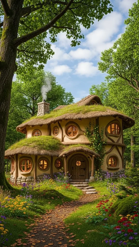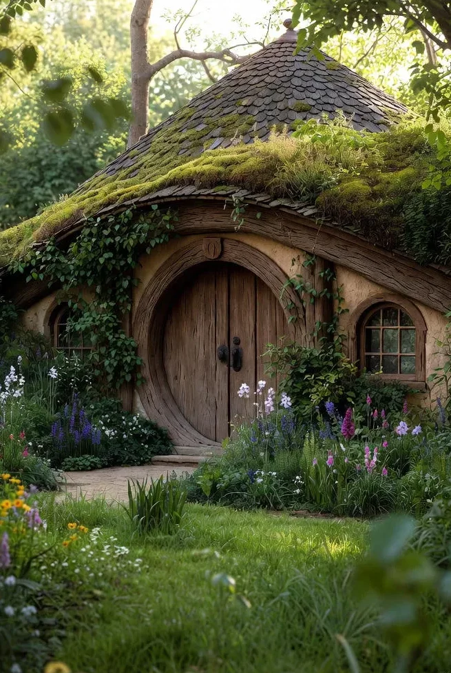 Built into a hillside with an earth-sheltered roof. Round doors and windows are the signature of this fantasy-inspired style. The earth provides incredible insulation, keeping it cool in summer and warm in winter.