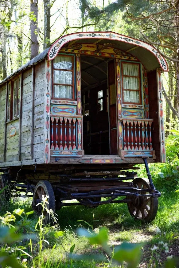 Highly decorative, horse-drawn wagons known for intricate carving and painting. They feature a curved roof and a small porch at the front. The interior is often a riot of fabric, color, and built-in carpentry.