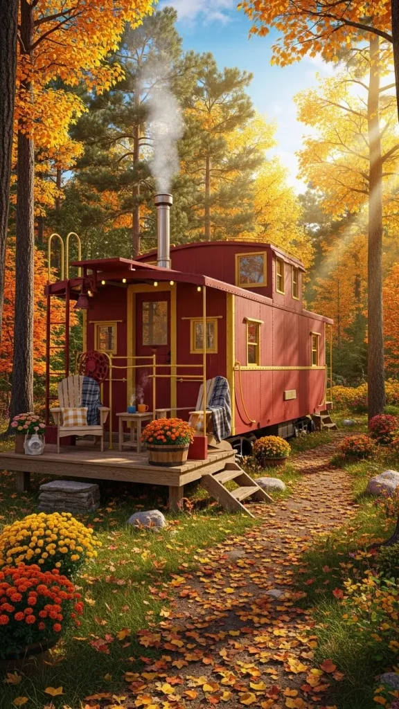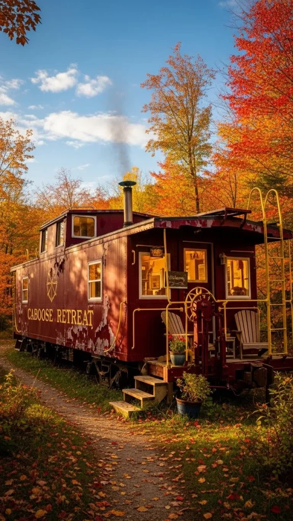A retired rail car placed on a section of track in the woods. They are long, narrow, and filled with heavy steel charm. The “cupola” (raised section) offers a great reading nook with a view.