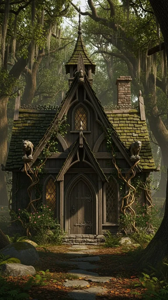 Resembling a small chapel or a witch’s cottage with pointed arches. Dark wood, stained glass, and steep roofs define this style. It appeals to those who love mystery and dark romanticism.
