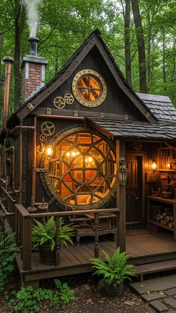 Exposed copper pipes, gears, and brass fittings characterize this interior. The exterior might look like a machine shed or a submarine part. It is a celebration of Victorian-era industrial science fiction.
