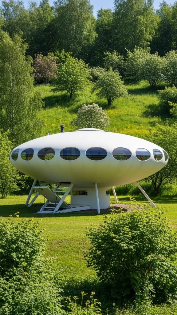 Based on the 1960s prefabricated plastic houses that look like flying saucers. They are elliptical and stand on legs. While rare, building a replica creates an unforgettable retro-future getaway.