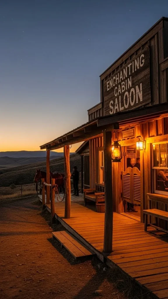 A cabin with a false front facade to look like an old western building. It features a wide boardwalk porch and hitching posts. Inside, a long wooden bar serves as the kitchen island.
