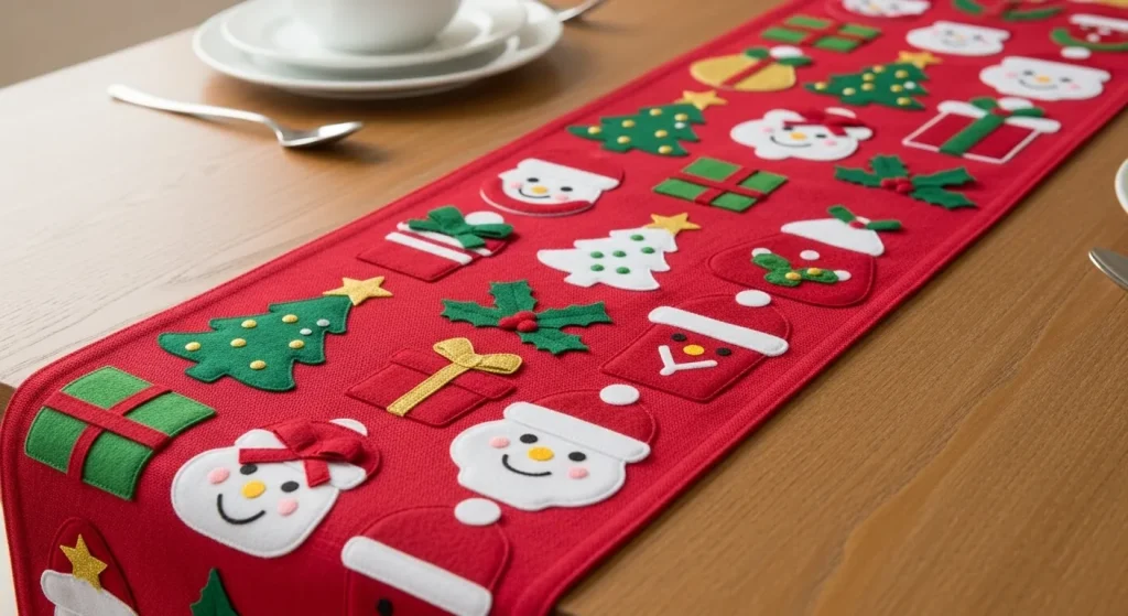 Felt is an ideal fabric for creating no-sew appliques to decorate your table runner. Use double-sided fusible webbing to iron on festive shapes like snowflakes, reindeer, or Christmas trees. This is an easy and fun way to add personality and charm to a plain runner.
