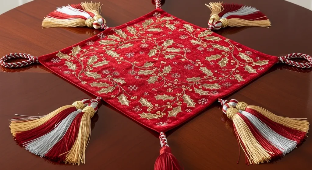Add a cheerful, festive sound to your holiday table by sewing small jingle bells onto your table runner. You can attach them to the corners, the ends of tassels, or scatter them along the border. They are a delightful detail that adds to the magical atmosphere of the season.