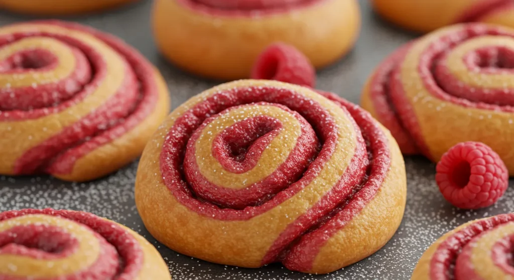 The tartness of fresh raspberries provides a beautiful contrast to the sweet, soft dough, creating a perfectly balanced and delicious roll.