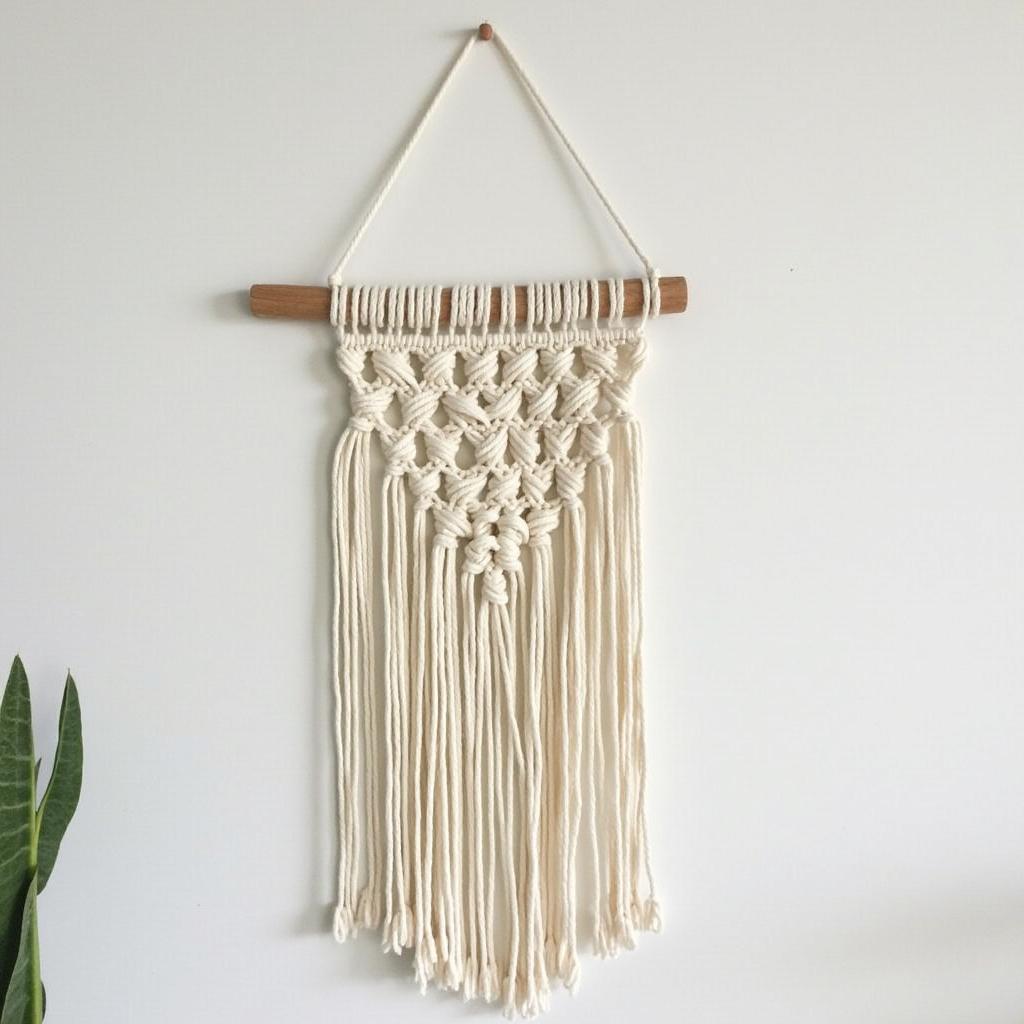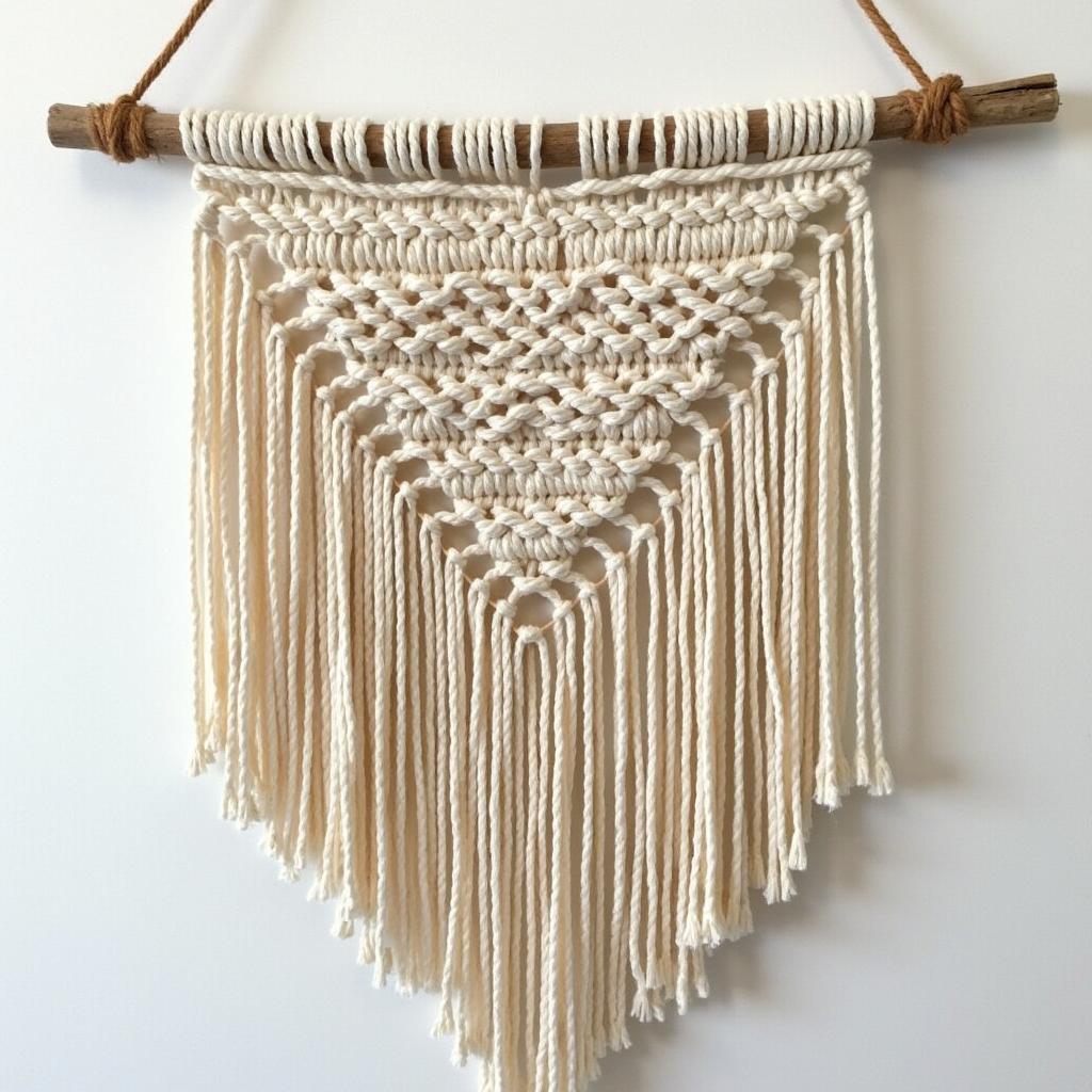 Opt for simple knots and high-quality neutral-toned cords for a modern and understated piece that adds texture without overwhelming the space. A minimalist design might feature a clean pattern like a series of square knots or a simple V-shape on a natural driftwood dowel.