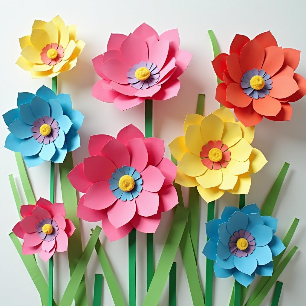 Create a joyful mix of smaller, more colorful paper flowers for a lively and playful wall display.