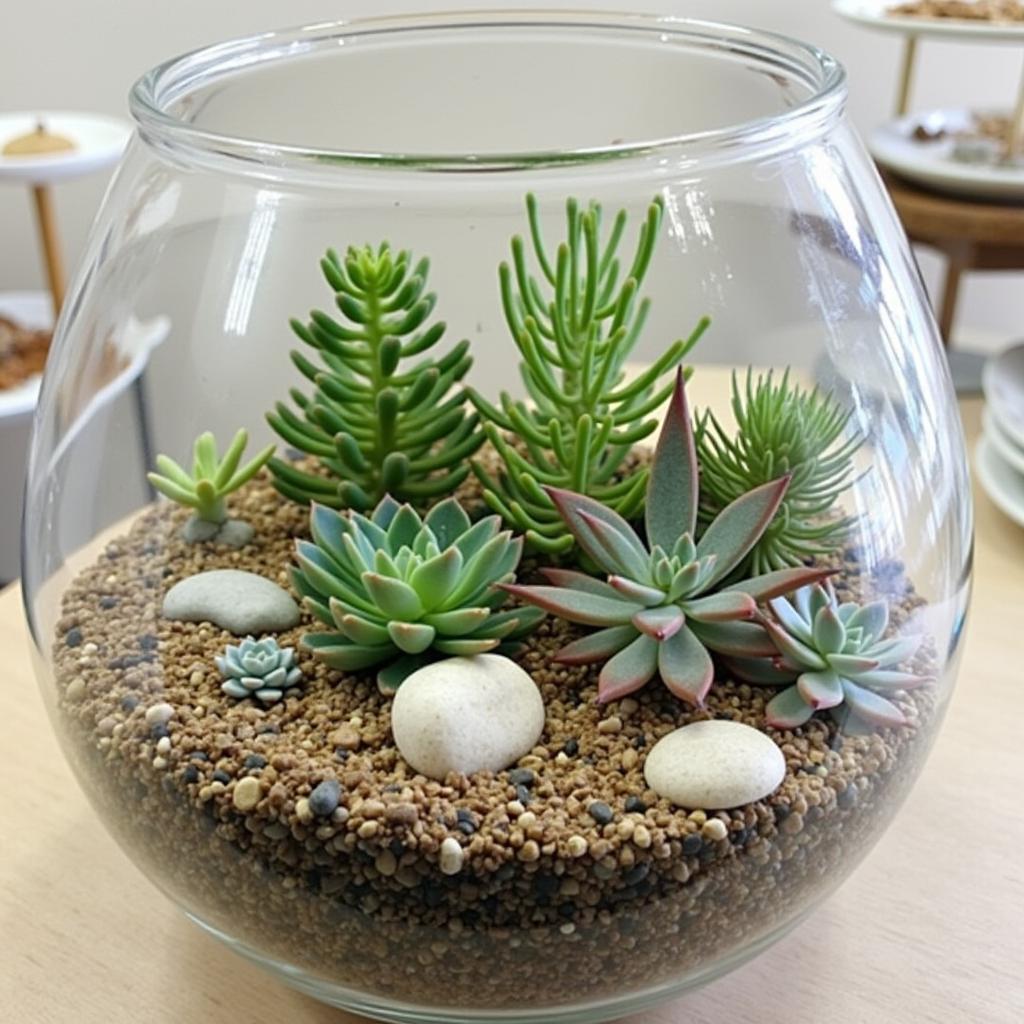 Remember to add a layer of pebbles at the bottom for drainage before adding activated charcoal and succulent-specific soil. The variety of shapes, colors, and textures of different succulents allows for a beautiful and creative arrangement.