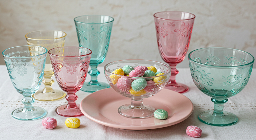 Vintage glassware in soft, dreamy pastel hues, such as Depression glass, milk glass, or carnival glass, can beautifully elevate your Easter tablescape and decor.