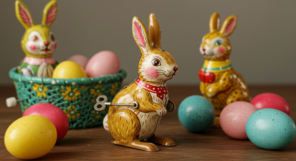 Classic tin toys, like colorful lithographed wind-up bunnies or egg-shaped noise makers, add an incredibly playful and nostalgic touch to your Easter decor.