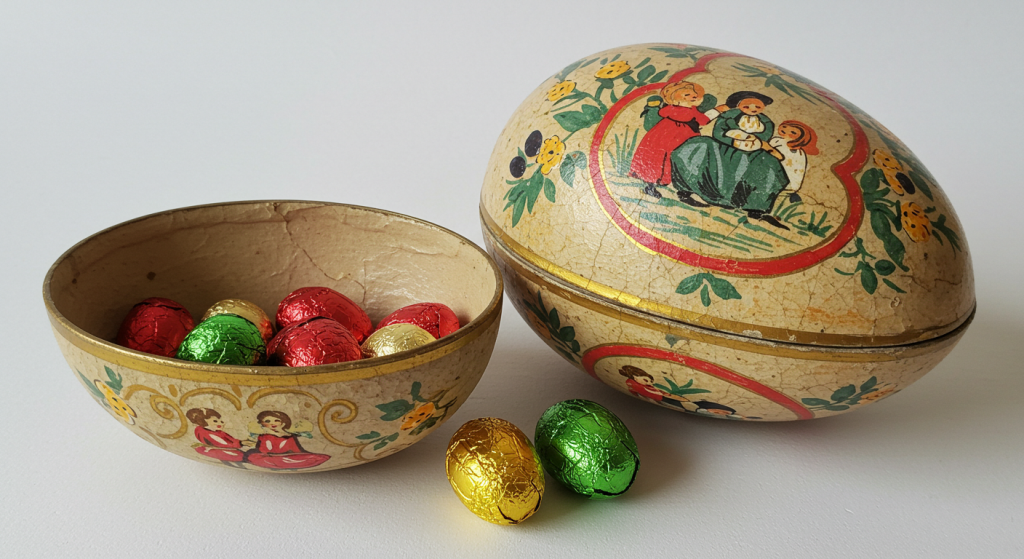Paper mâché eggs were a hugely popular Easter decoration and container in the early to mid-20th century, especially in Germany. They have a distinct, lightweight charm and a wonderful, tactile quality.