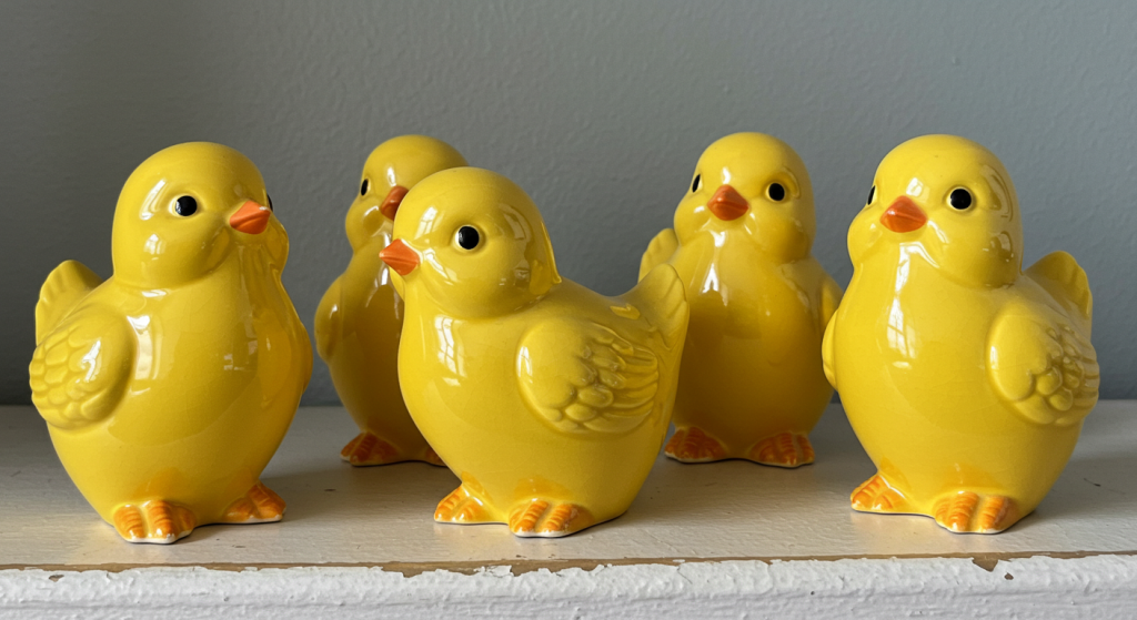 - Display a group of three or five ceramic chicks in a playful scene on a windowsill or a kitchen shelf.