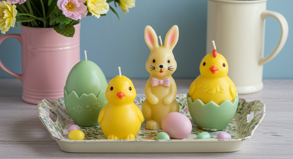 Vintage Easter candles, often molded into the charming shapes of bunnies, eggs, or chicks, add both warmth and a distinct retro aesthetic to your Easter display.