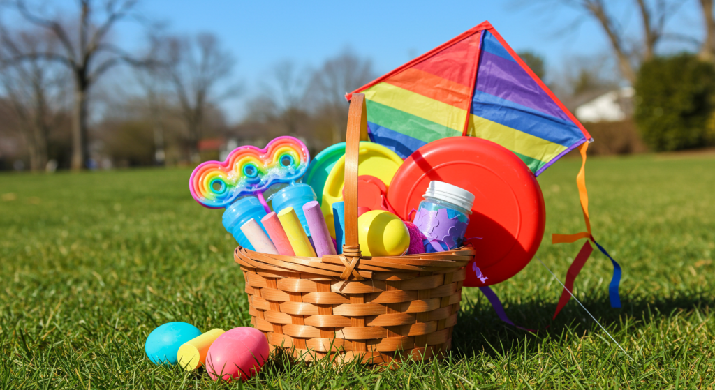 For kids, you can add classics like colorful sidewalk chalk, a giant bubble wand, a frisbee, or a simple kite that is perfect for a breezy spring day.