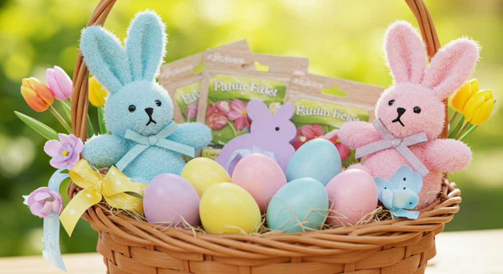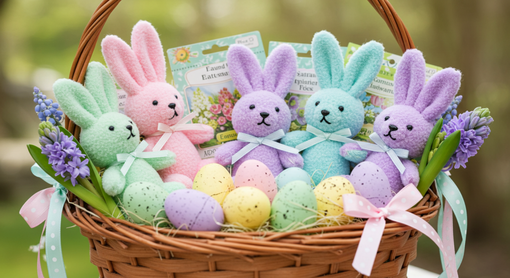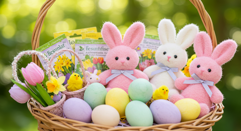 Think soft plush bunnies, beautifully decorated pastel-colored eggs, and packets of flower seeds that promise a blooming garden. You can also include festive decorations to capture the spirit of a classic, nostalgic Easter.